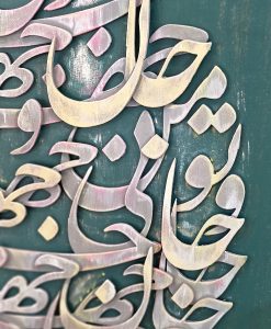 توضیحات: این اثر بر روی بوم نقاشی و با استفاده از رنگ اکریلیک اجرا شده است. برجسته بودن اشعار موجب چشم نواز شدن اثر و ارزشمندی آن شده است.
